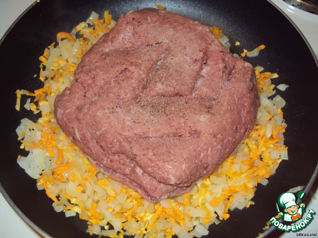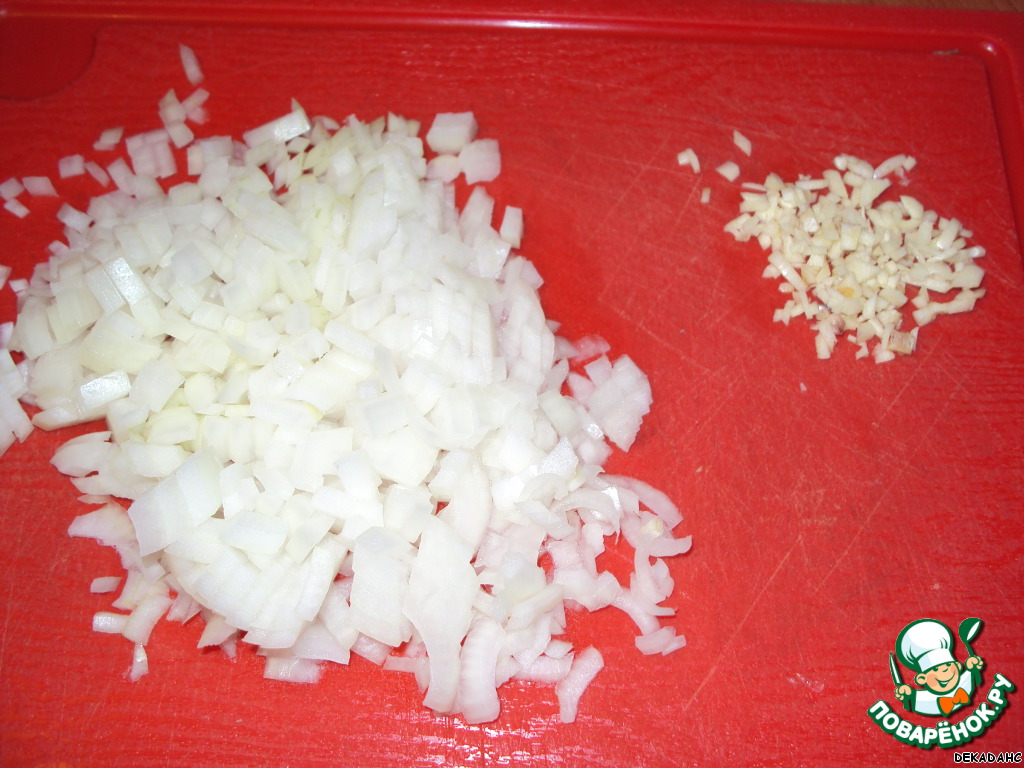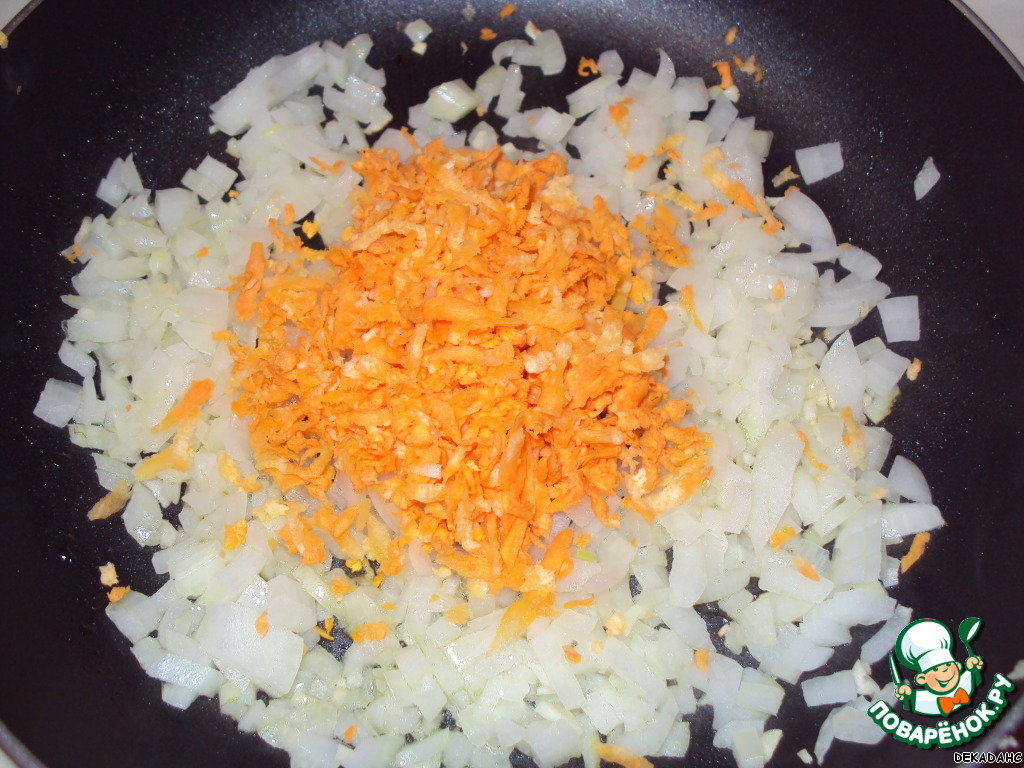 Морковь натираем на терке, добавляем к луку и чесноку.