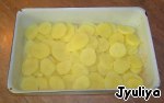 Форму смазать растительным маслом, можно посыпать молотыми сухарями. Картофель нарезать кружочками, уложить в форму.