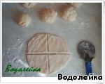 Шарик раскатать в лепешку и разрезать на 4 части (как на фото).