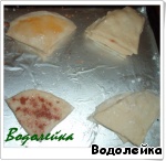 Противень смазать маслом (можно застелить пекарской бумагой). И начинаем формировать булочки, выкладываем один на другой наши треугольнички (ровность краев не имеет значения). При этом на каждый слой что-то выкладываем. Я делала закусочные булочки с тертым твердым сыром и соусом из зелени.