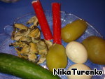 Измельчаем на кусочки наши мидии, выкладываем на слой огурцов.