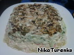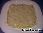 Белки яиц натираем на мелкой терке, выкладываем на «кальмаровый» слой, солим, смазываем майонезом.