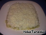 Вареный картофель натираем на терке, выкладываем на тарелку в форме квадрата, солим, смазываем майонезом.