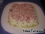 Мелко режем крабовые палочки. Снимаем панцирь с креветок и тоже режем (можно не мелко), можно и целыми оставить, если креветки небольшие. Слой не солим (креветки мы варили в соленой воде). Сверху слой майонеза.