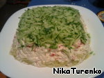 Натираем на терке свежий огурец, выкладываем на «креветочный» слой, солим, смазываем майонезом.