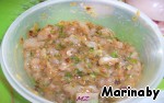 В нарезанное филе добавляем обжаренный, карамелизованный лук, петрушку, имбирь (очень люблю сочетание имбиря и курицы), смесь перцев, немного соевого соуса и все тщательно перемешиваем.