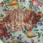 Нарезать ее с помощью машины для нарезки очень, очень тонко в длину. Если таковая машина отсутствует, то мясо слегка подморозить, затем нарезать ножом так тонко, как можете только. Положить на доску, постелить сверху пищевую пленку и постучите тяжелой сковородой, чтобы стало тоньше. Проверено - работает.