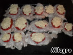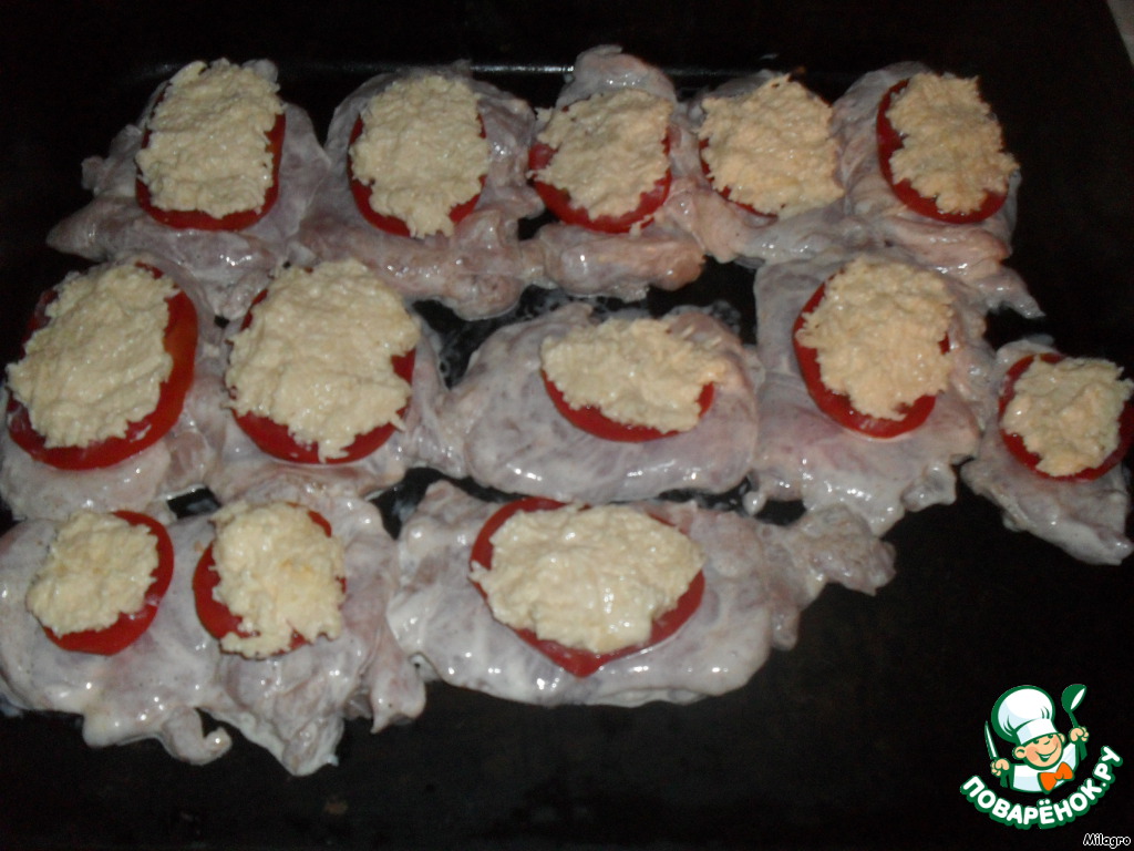Название говорит само за себя. Закуску из колец помидоров, на которые укладывается масса из сыра, чеснока и майонеза, наверняка, знают все. Вот я и подумала, а почему бы не добавить ее в состав основного блюда. Мои надежды стократно оправдались!