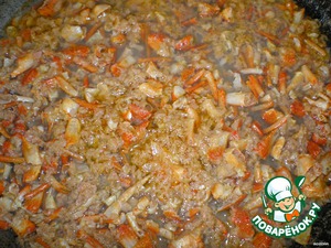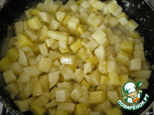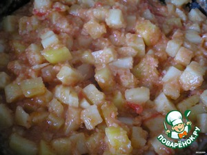 На подсолнечном масле поджарить лук с чесноком, добавить картофель, посолить и 2 минуты жарить, добавить раковый отвар и помидоры с сахаром. Перемешать. Добавить муку и тушить 10 минут. Добавить 600 г бульона, тушить. Когда до готовности картофеля останется 5 минут, переложить в кастрюлю и довести до готовности.