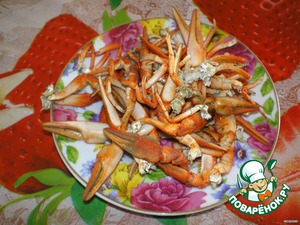 Клешни и лапки еще раз промыть после варки, положить в блендер и измельчить. Полученную кашицу выложить на сковороду, добавить сливочное масло, чуть прожарить и добавить 1,5 стакана воды. Довести до кипения и варить под закрытой крышкой 10 минут. Процедить.