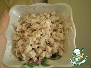 Из куриной грудки сварить бульон (подсоленный), чтобы в общей сложности получилось 700 г бульона. Куриную грудку измельчить.