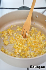 Репчатый лук мелко нарезать кубиками, обжарить в оливковом масле до золотистого цвета.