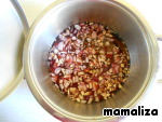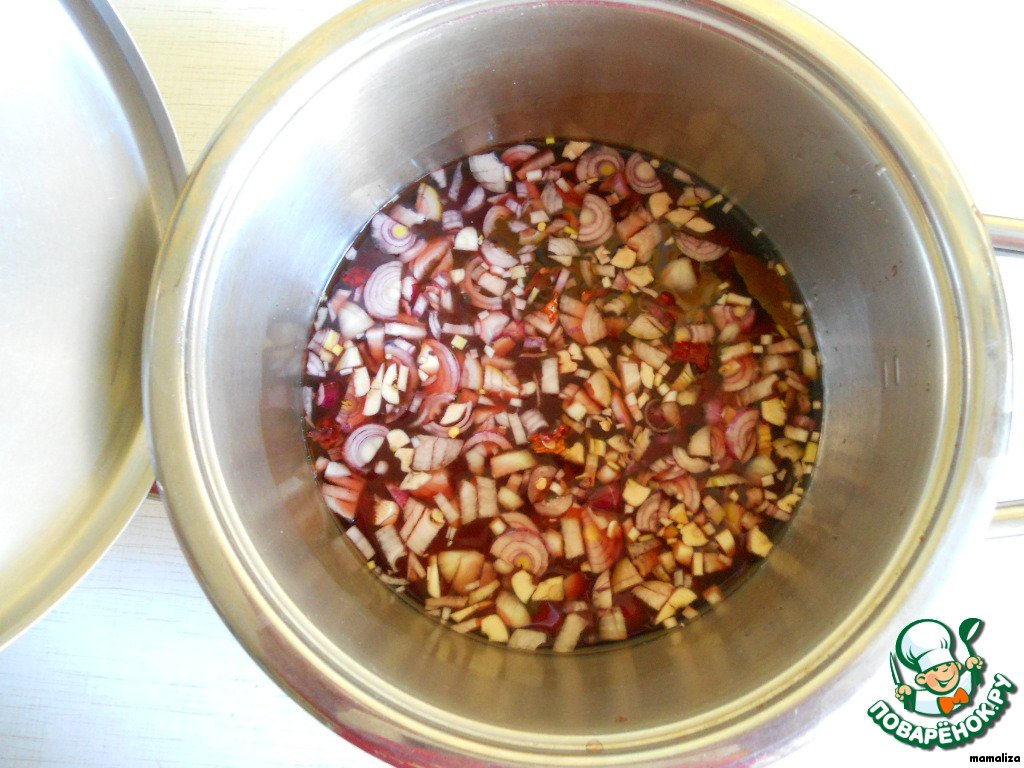 В кастрюле смешиваем все ингредиенты для маринада. Лук и чеснок измельчаем, добавляем в маринад. Ставим на огонь и доводим до кипения.