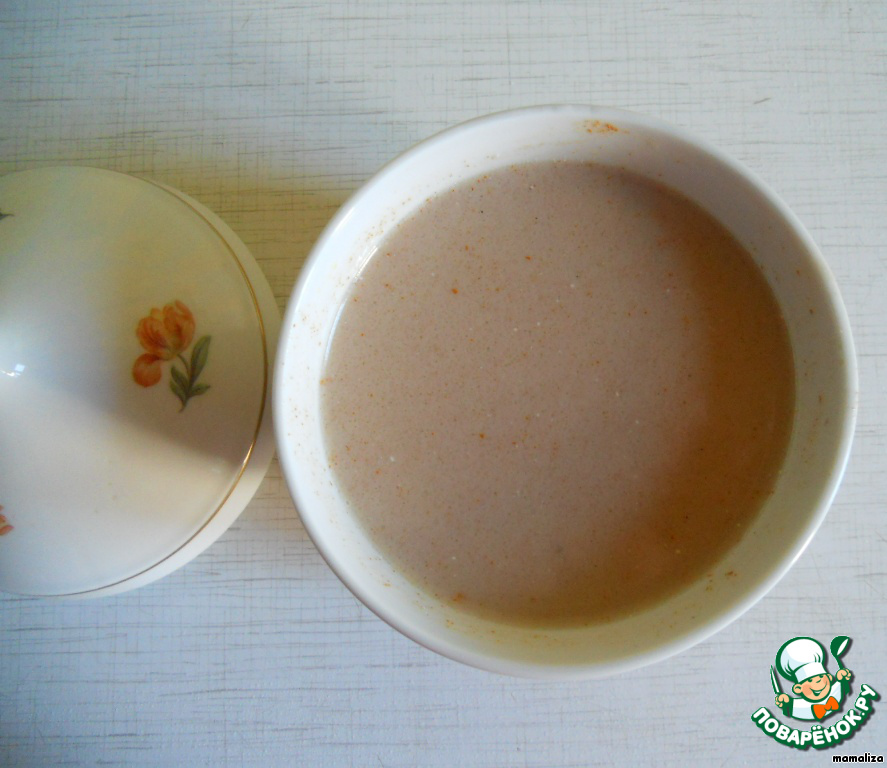 Маринад немного остудить, процедить, добавить горчицу и сметану.