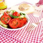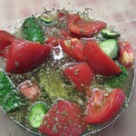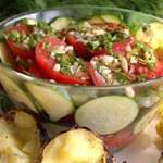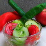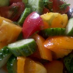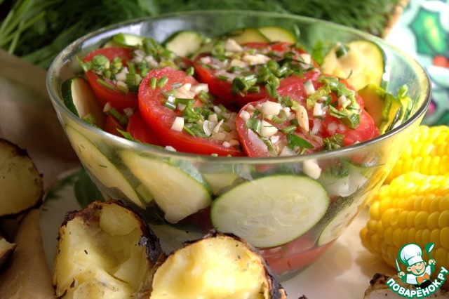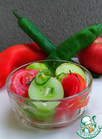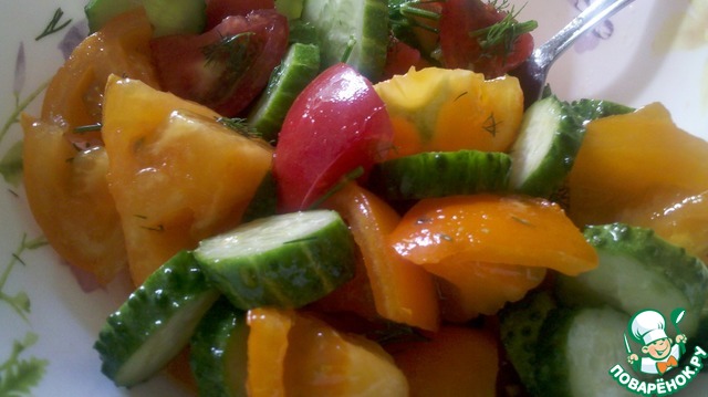 Помидоры и огурцы нарезать, помидоры на четыре части, а огурцы небольшими бочонками, т. е. тоже на четыре-пять частей. Сложить в контейнер, пересыпая базиликом (у меня сухой, но лучше использовать свежий), мелко нарезанным чесноком (если чеснок молоденький, то нарезать вместе с веточками) и перцем горьким по вкусу. На дно контейнера положить зонтик укропа.