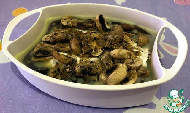 Выложить смесь в контейнер поверх мяса, если грибов получилось много, убрать их под грудку. Поставить контейнер в чашу пароварки на 30-40 мин. в зависимости от размера грудки.