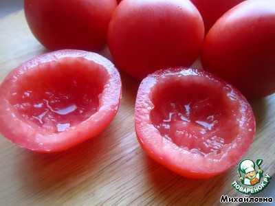 • Помидоры разрезать пополам поперёк, вынуть сердцевину и положить срезами вниз, чтобы вытекла лишняя жидкость.