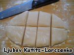 Далее, охлаждённое тесто нужно поделить на 8 частей. Я сформировала его в овал и прижала на посыпанной мукой поверхности, разровняла и разрезала.