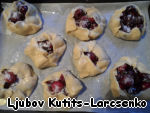 На сахар выкладываем черешню, немного, по 5-8 ягодок, сверху присыпаем кусочками шоколада и сбрызгиваем всё коньяком. Тесто по краям приподнимаем пальцами и прижимаем к ягодам. Я ещё смазывала места склеивания нашей смесью. В общем, натанцевалась хорошо..:)