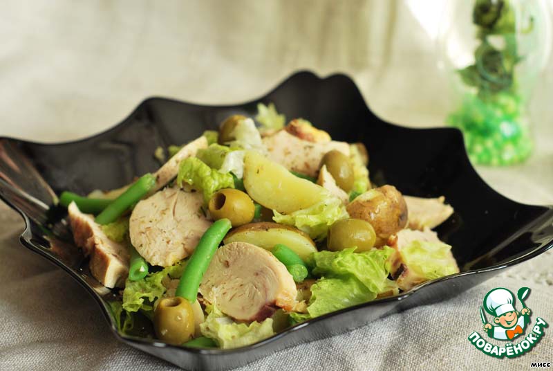 Теплый салат из курицы с картофелем и спаржевой фасолью. Летом хочется побольше зелени и свежих овощей. А чтобы такой салат был еще и сытным, можно добавить туда куриное филе, запеченное в духовке. Этим салатом можно пообедать или сытно поужинать.