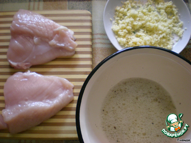 Белок яйца слегка взбить с перцем и солью. Твердый сыр мелко натрите. Обмакните кусочек мяса в белок, а затем в сыр. Уложите подготовленные кусочки на фольгу и отправьте запекать в духовку на 25-30 минут при температуре 180* до румяной корочки.