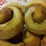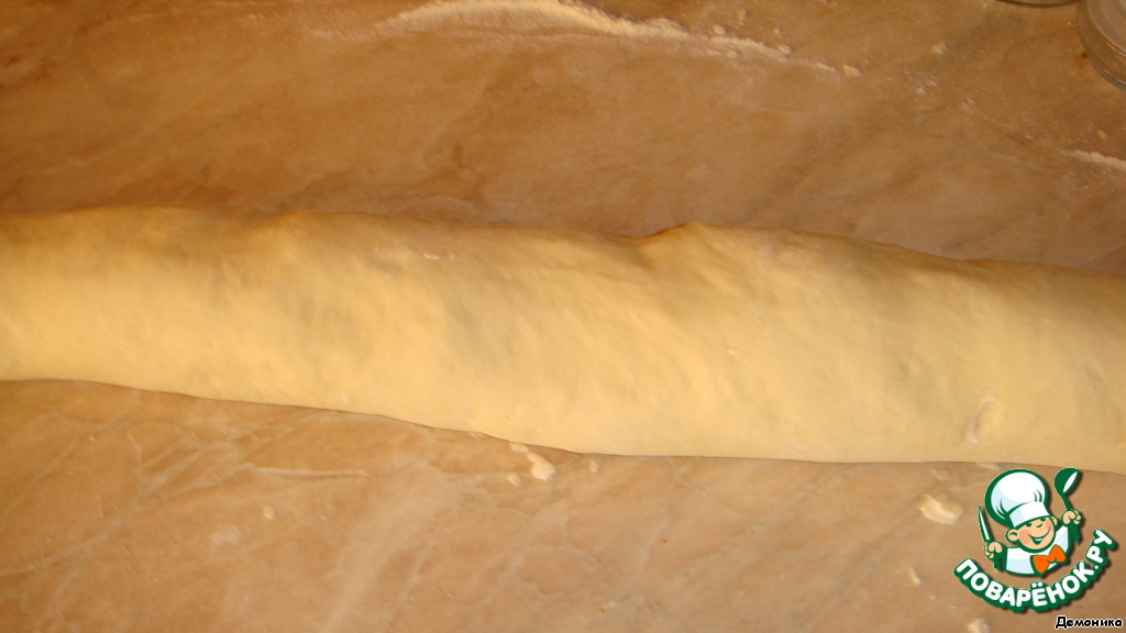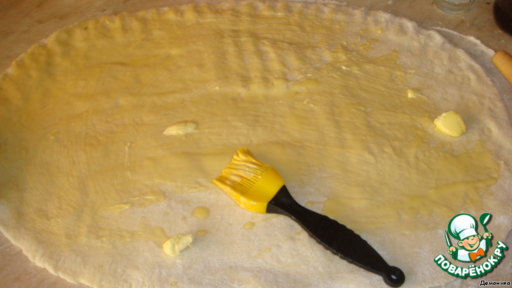 Раскатать тесто в пласт толщиной 3-5 мм. Смазать его размягченным сливочным маслом и присыпать сахаром. При желании можно присыпать ещё корицей или кардамоном, кто как любит. И варьировать количество сахара. Вместо масла не возбраняется сливочный маргарин.