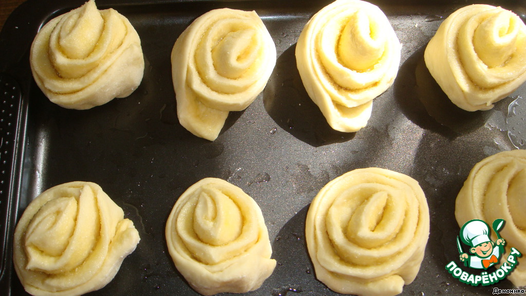 Каждый кусочек защипнуть с одной стороны, чтобы булочки стали похожи на розочки и меньше вытекала начинка. Уложить на смазанный противень на расстоянии. Дать отстояться минут 10.
