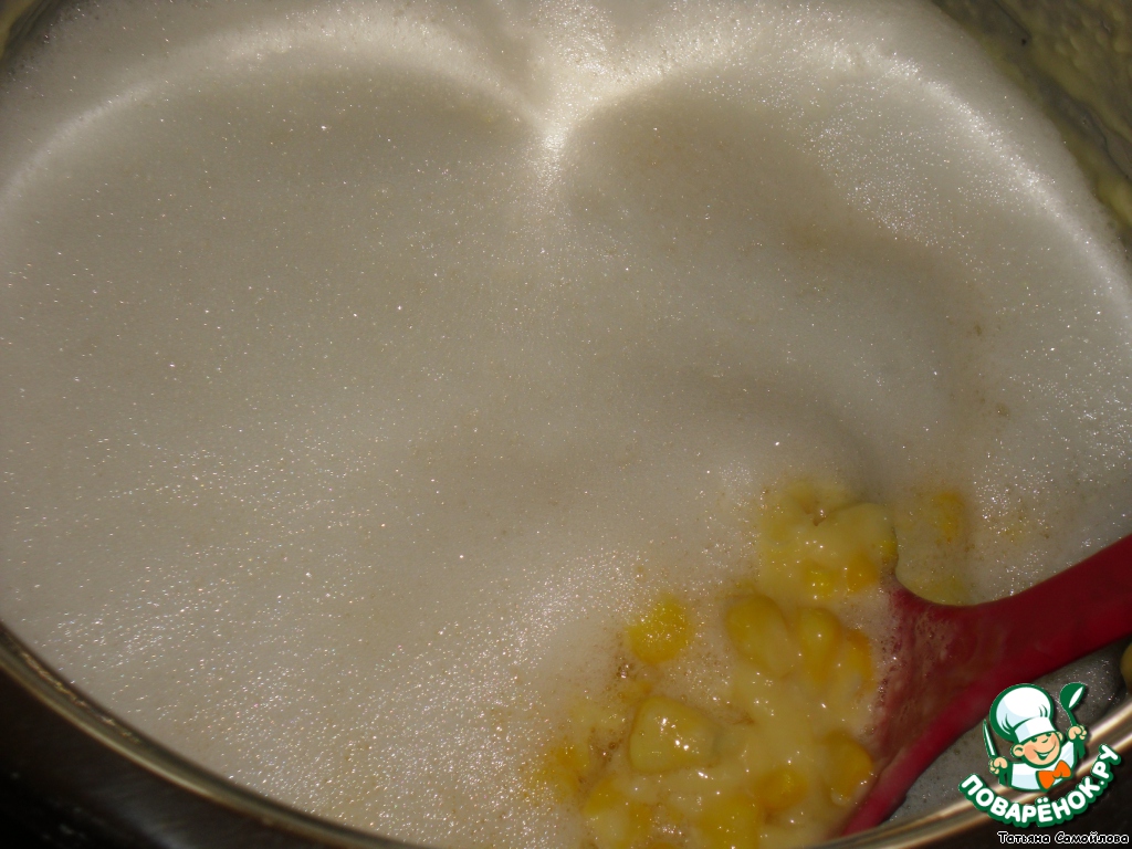 Добавить в молочную смесь кукурузу, чеснок (натертый на мелкой терке), соль, перемешать.