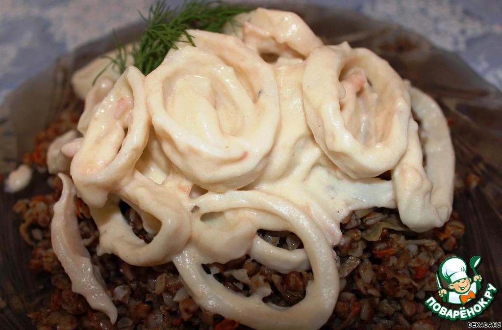 Когда сметана "распустится", выложить на сковороду нарезанные кальмары, посолить,