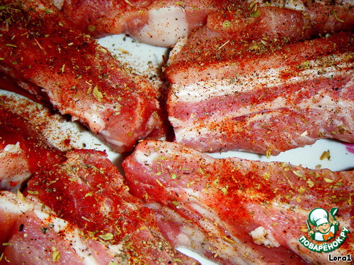 Рёбра вымыть, у основания рёбрышек поддеть ножом плёнку и отделить её от мяса, чтоб мясо хорошо пропиталось.