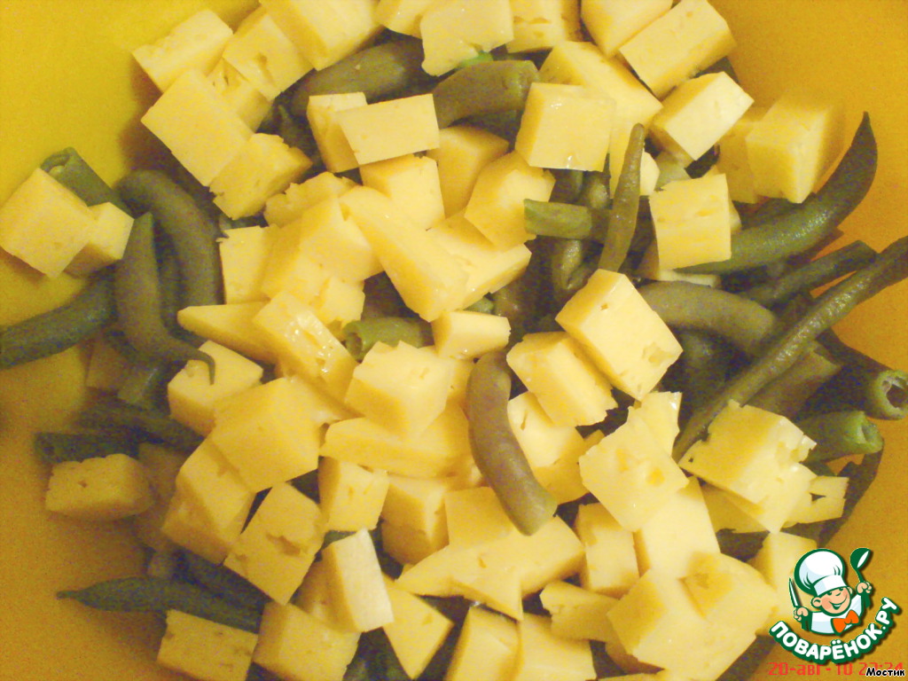 Стручки фасоли очистить от прожилок, обрезать концы и отварить в подсоленной воде. Остудить, нарезать кусочками. Если берете замороженную - её просто отварить.