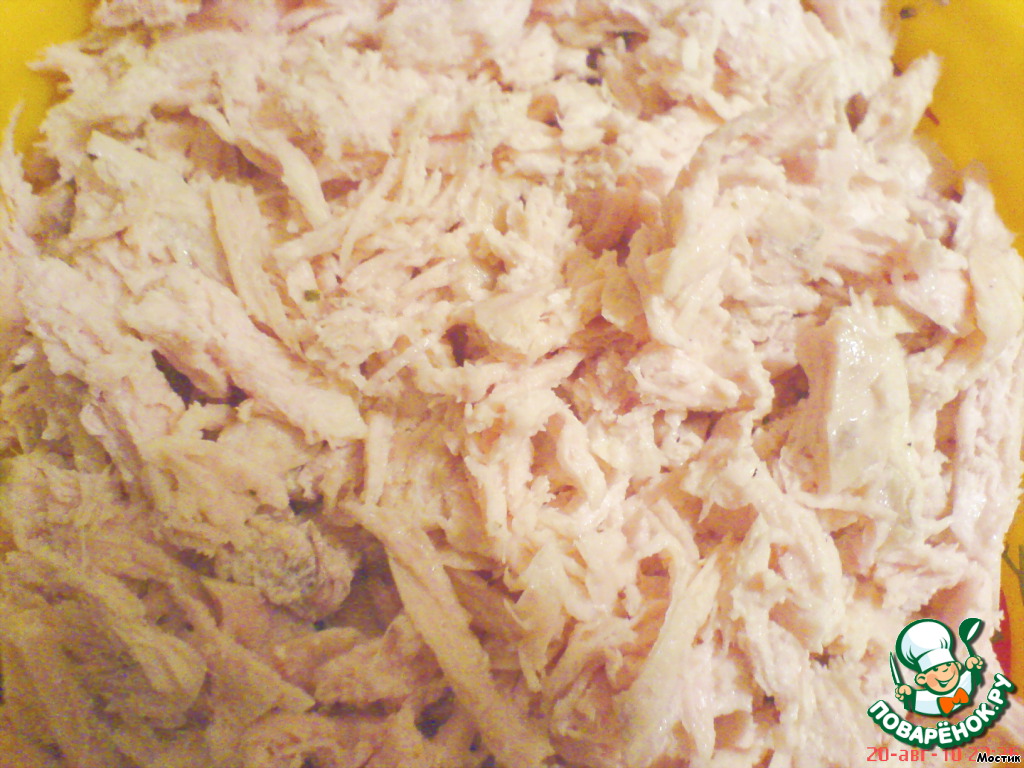 Куриную грудку отварить, измельчить. Если у вас ветчина, то её нужно порезать на небольшие полоски (равноценные фасоли).