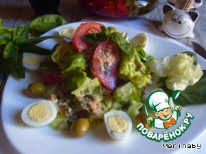 На салат выкладываем консервированный тунец, затем зелень и овощи, добавляем оливки и перепелиные яйца.
