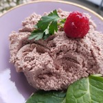 Сначала паштетик показался мне жидковат (если после протушки продуктов вас беспокоит жир, слейте), но после холодильника, подостыл, набрал товарный вид. Настоятельно рекомендую использовать куриную печень или телячью (говяжью). Украшения у меня не очень: времени нет, да и с творческим воображением напряженка. Это мой рецепт.