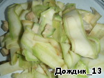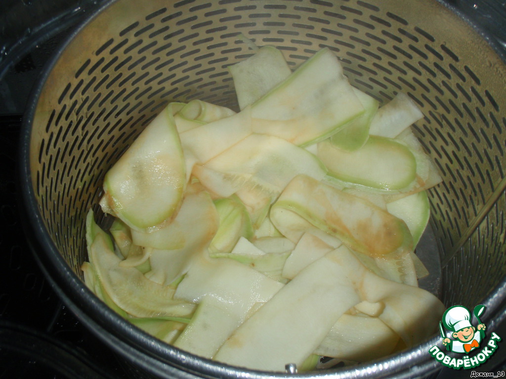 Овощечисткой тоненько нарезать молодой кабачок и отварить его 10 минут в пароварке.