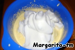 Продолжая взбивать желтки по чуть-чуть добавляем воду. Желтками занимается "Поварёнок" а мама (это я) в это время взбивает белки в крутую пену, по старинке - венчиком (миксер-то один:)). |