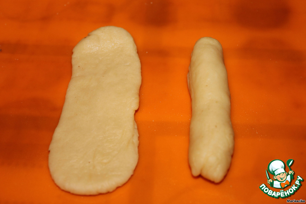 Из шарика руками делаем жгутик, который раскатываем в длинную лепешку. |