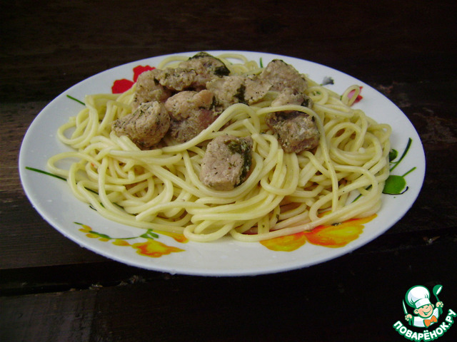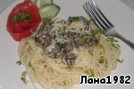 Подаем спагетти с теплым мясом, посыпав зеленью и сыром.