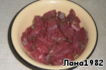 Мясо нарезаем тонкими кусочками поперек волокон. Солим, перчим, добавляем специи и обжариваем на растительном масле до румяной корочки. Уменьшаем огонь до минимума.