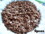 Для приготовления шоколадной крошки необходимо: смешать маргарин, муку, сахар, какао. Крошку растереть руками прямо на пирог. Если масса крошиться не будет, добавить еще немного муки.