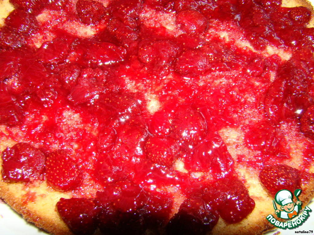 Составляем торт. Бисквит разрежем на 2 коржа. На блюдо кладем нижний корж, намазываем его пудингом. Сверху накрываем вторым коржом и покрываем шоколадной глазурью, которая сама "стекает" по бокам. Так в оригинальном рецепте... В этот раз по многочисленным просьбам своих домочадцев я решила поэкспериментировать. Накануне мной был сварен клубничный джем, не приторно-сладкий, а с легкой кислинкой.