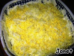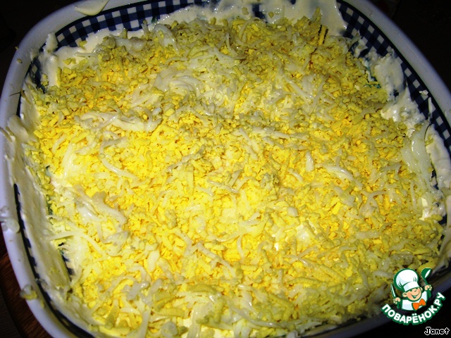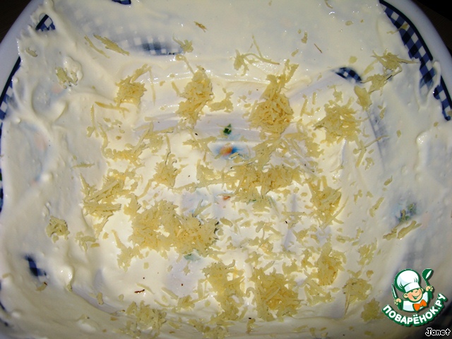 Яйца натереть на мелкой тёрке, смазать сметанкой.