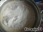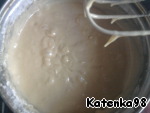 Взбиваем. После чего добавляем муку. Сначала нужно просто перемешать аккуратно, а потом взбивать. Тесто должно получиться примерно, как 20% сметана. Немного гуще.
