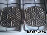 Смазываем форму маслом. Я делала на конфорках. Разогреваем обе стороны. Наливаем тесто, распределяем. Закрываем форму и жарим примерно 20 минут. Тут уже у кого какая форма.