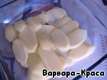2. Через минут 50 чистим картошку и режем тонкими ломтиками. Выкладываем в стеклянную форму для запекания.