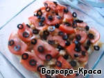 3. Делаем соус из горячих сливок, в которых разбавляем тар-тар и остальные специи (по вкусу). На крупной тёрке трём Дор Блю и посыпаем картошку. Выкладываем ровным слоем рыбу. Режем тонкими полукружками помидор и выкладываем на рыбу. Нарезаем маслины и распределяем сверху помидор.