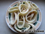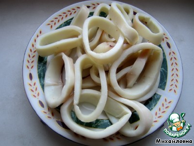 Кальмары нарезать кольцами.