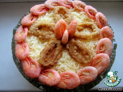 Салат с морепродуктами - кальмарами и креветками. Послойный, необычность салата в подготовке кальмаров. На сайте есть такой рецепт, но я хочу предложить несколько другой вариант. Более летний.