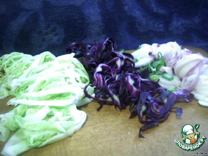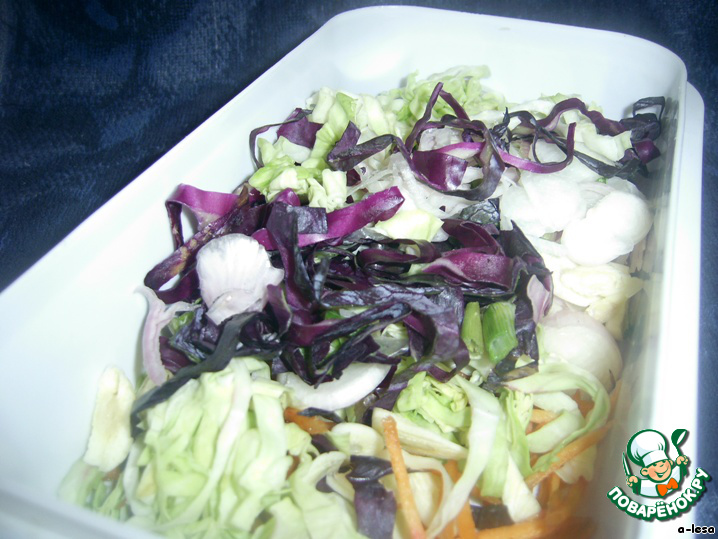 • Капусту я брала двух видов, измельчить всё в произвольной форме - как на любимый салат.