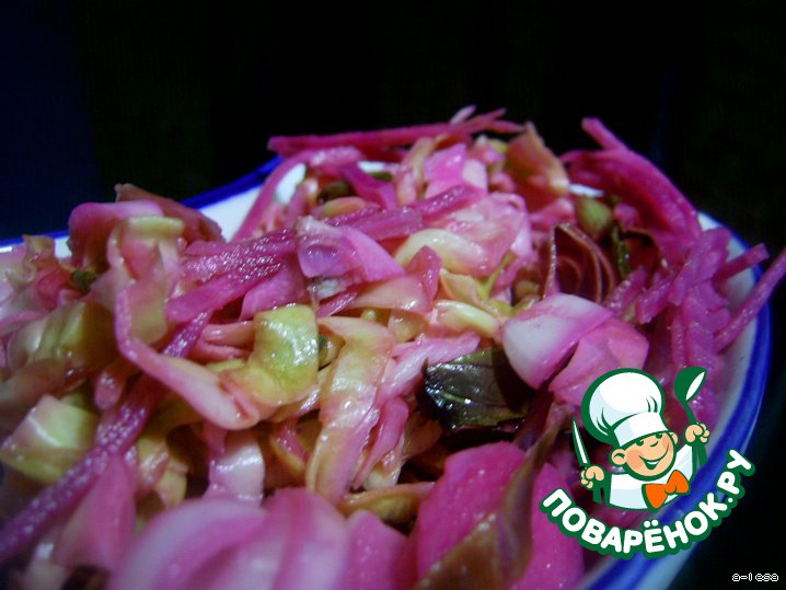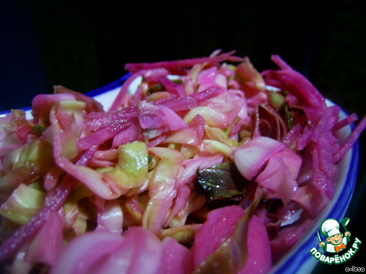 Ну и чего ждать? Взяла и приготовила, фотоотчет прилагается. Я бы назвала закуска "дружба народов"- грузинская острая капуста и русское(украинское) сало. Меня заинтриговало именно розовое сало(люблю удивлять гостей и близких и делать из обычных продуктов необычные блюда), так как такой салат делаю часто. Сало, пропитанное маринадом- это открытие, ему так подошел этот вкус![x]16:52 04.07.11 Отредактировано создателем комментария[/x]